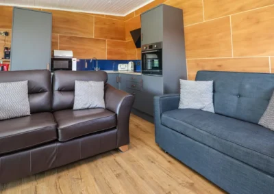 - Open-plan living space with kitchen, dining area, and sitting area
