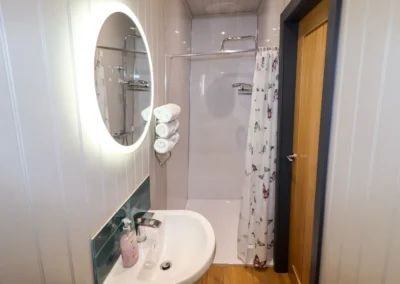 - One double bedroom with TV and en-suite walk-in shower, basin, and WC